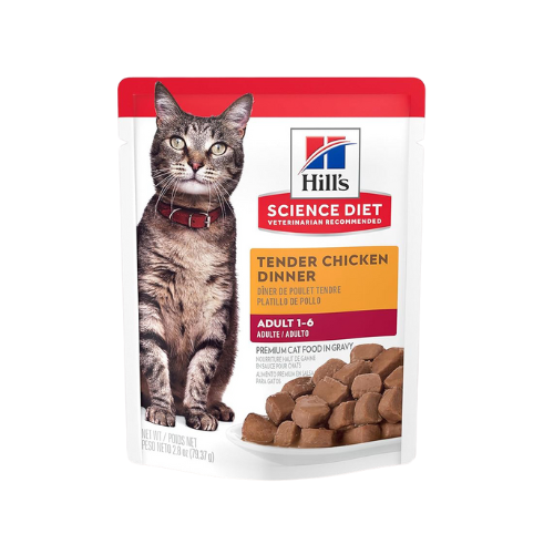 Hills Pouch Gato Adulto Pollo la comida húmeda para gatos ahora vienen en un pouch que es fácil de abril y fácil de servir ideal para gatos adultos de 1 a 6 años sirve esta nutricion como una comida por si sola o mezclara con su alimento seco para gatos.